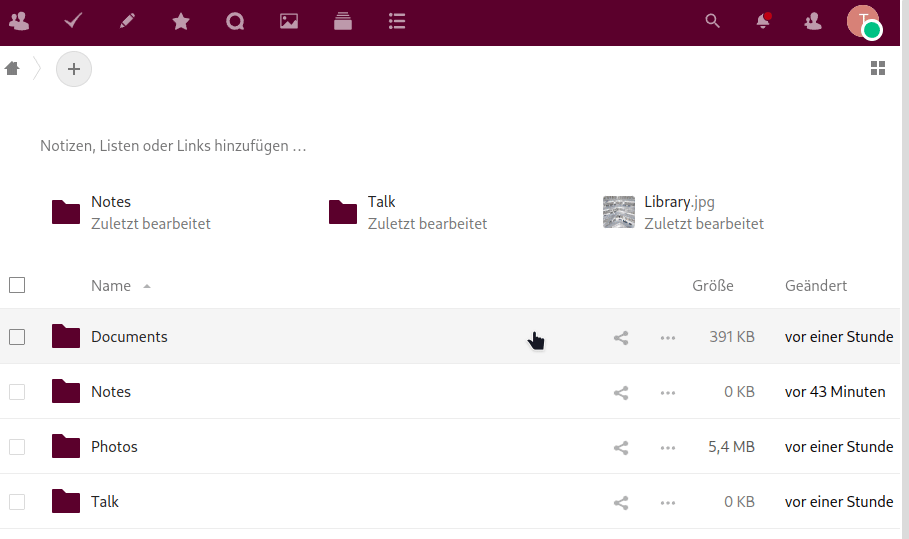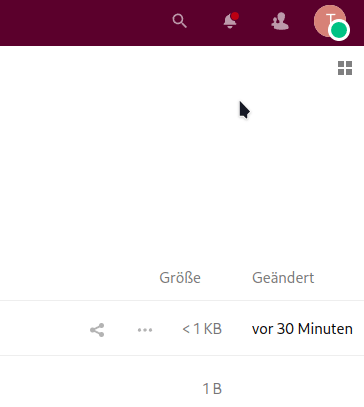 Jedes Mal, wenn Du einen Link, ein Verzeichnis oder eine Datei mit jemandem teilst oder jemand mit Dir, ein Dokument oder eine Datei geändert wird oder ein Administrator oder anderer Nutzer Dir eine Nachricht sendet, wirst Du hier benachrichtigt (ein hervorgehobener Punkt erscheint).