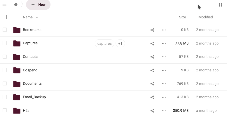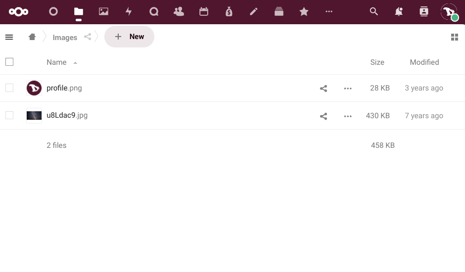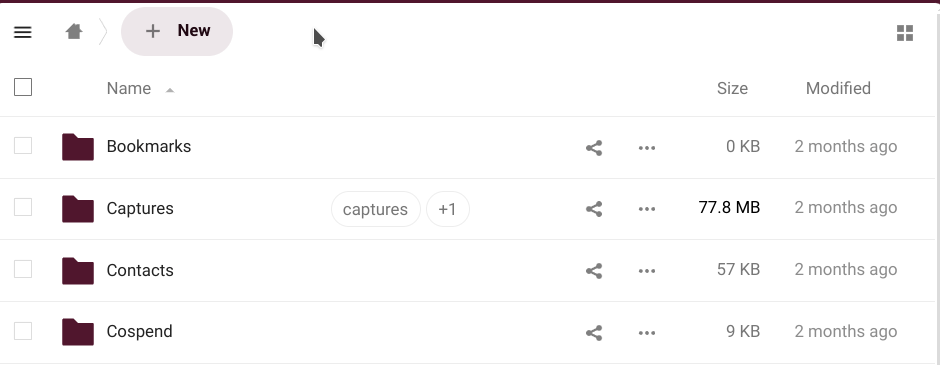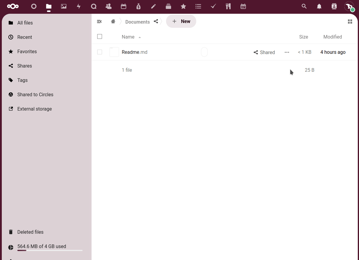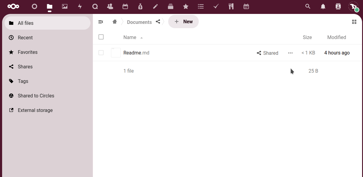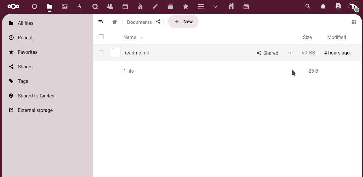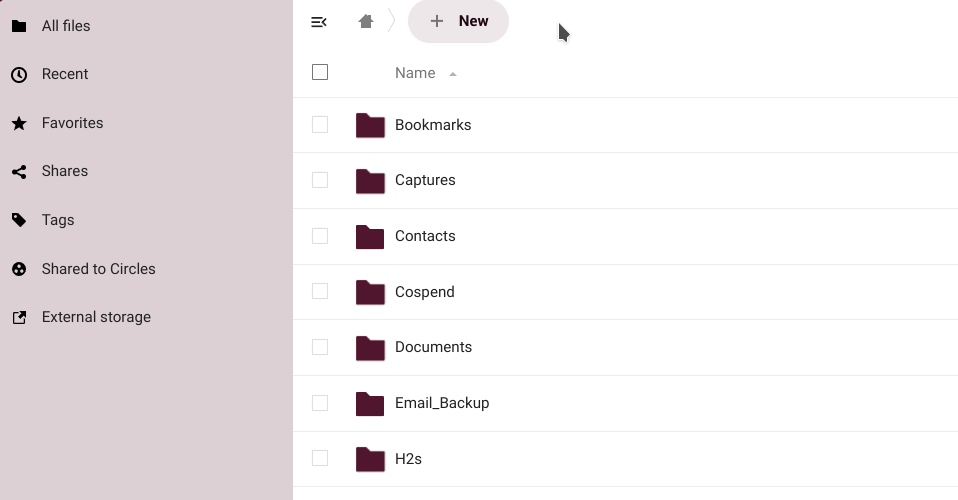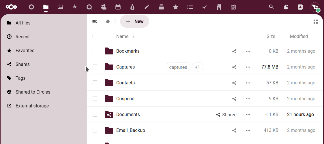 • The left sidebar let's us filter files based on certain criteria (recents, favorites, shared, by tags, shared with circles or from external storages).