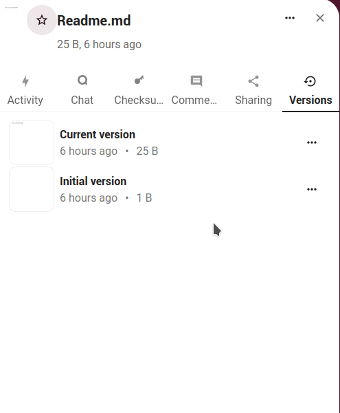 • Versions: this tab contains the changes history of a file or folder where we can roll back any of them to any previous version.