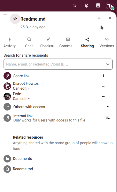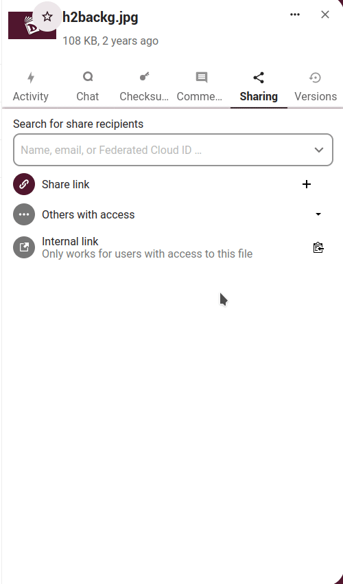 Another way of sharing a file or folder is via an internal link we can share with other users, groups, circles or people in a Talk conversation.