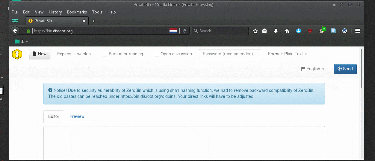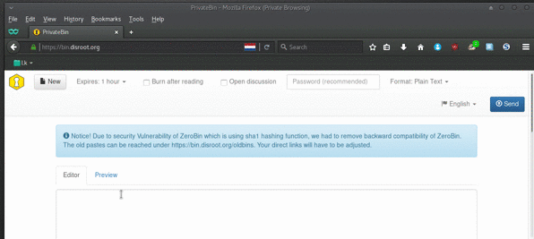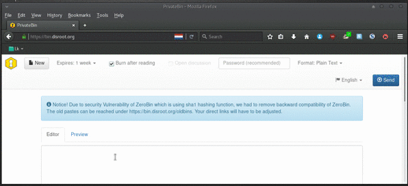 This is a very simple and basic discussion board that you can use to communicate in a more private way with others. None except people you've shared the link with (not even system administrators of Disroot) will be able to read your discussion. After set expiry, the entire conversation will be erased leaving no trace of it.