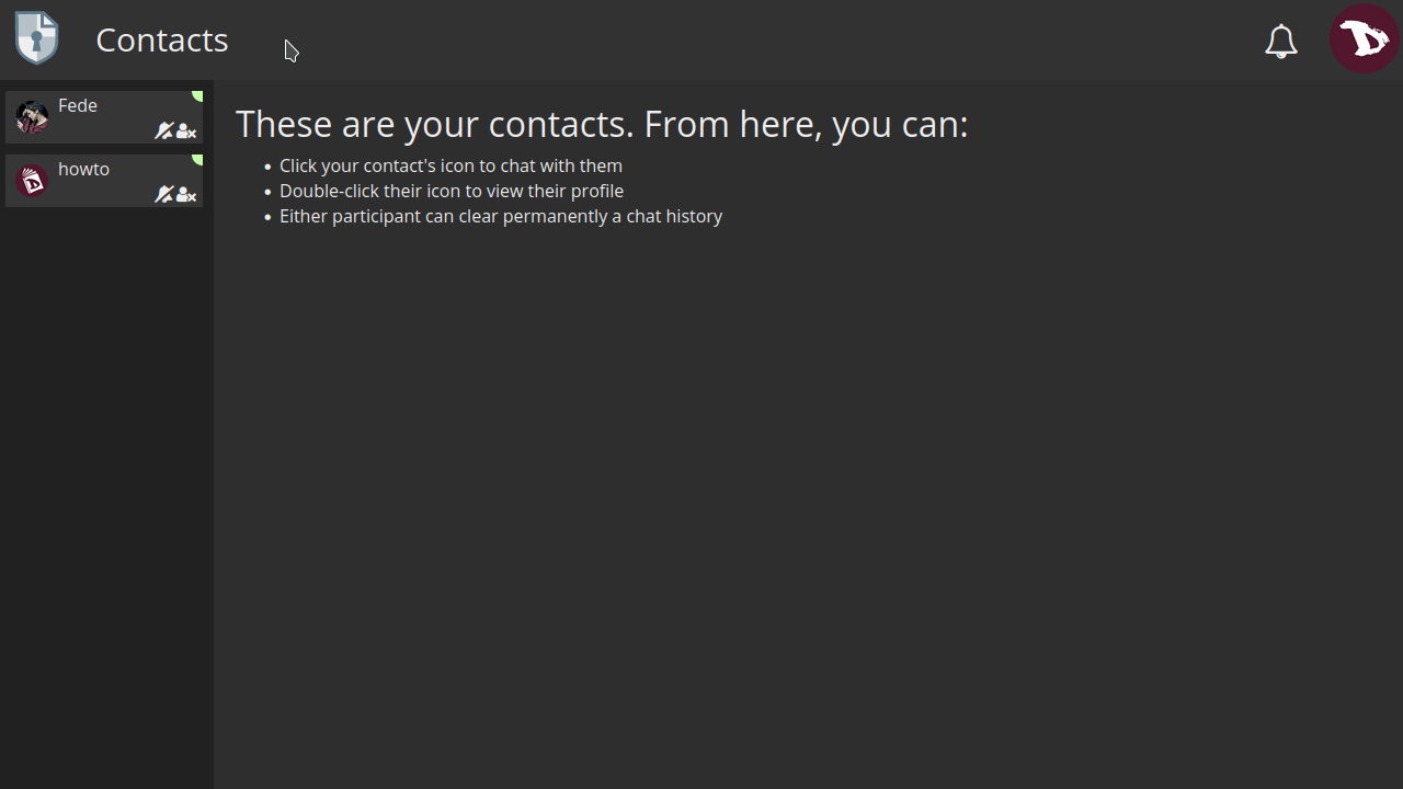 To access your contacts, go to the user menu -> Contacts. All of them are listed at the left.