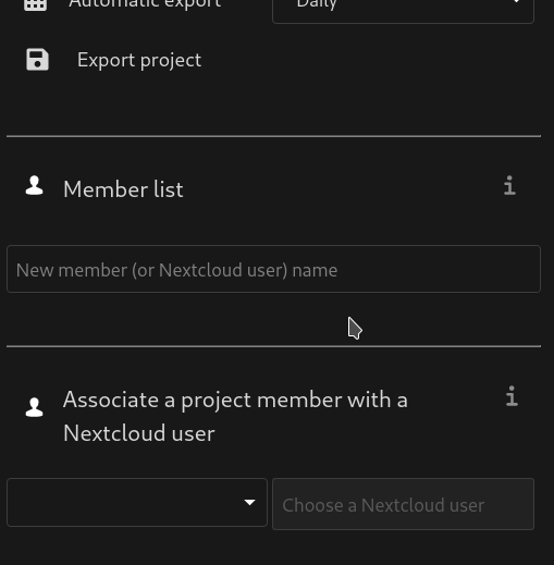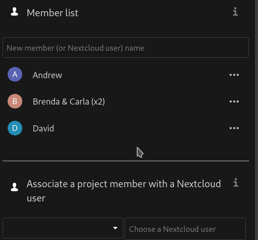 To add a member just click on the "three dots" icon and select Add member. The right panel will open and you will be able to add a new member from the Member list option in the Settings tab. You can also add a Nextcloud user from the same instance, assign a color, rename and set the weight of the member.